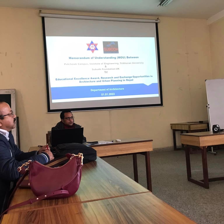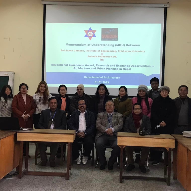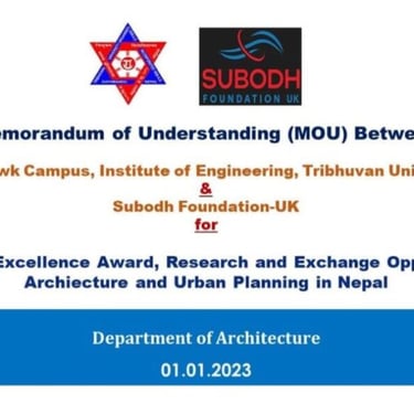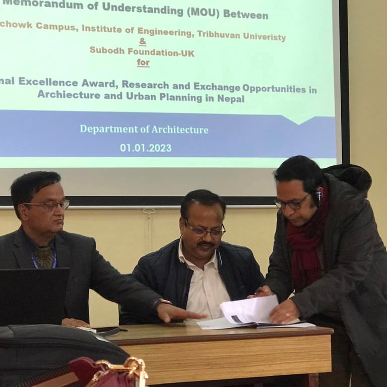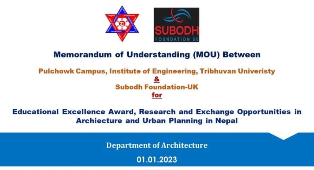 A Memorandum of Understanding (MOU) was signed between Pulchowk Campus, IOE and Subodh Foundation, UK to establish EE awards and other research opportunities for bachelor, various masters and PhD programs run in Department of Architecture for a period of 15 Years! The MOU was signed by Associate Professor Dr Indra Prasad Acharya, campus chief of Pulchowk campus and Er Subodh Timilsina, president of Subodh Foundation UK in the witness of Dr Sanjaya Uprety, HOD, Dept of Architecture! The total award money amounts to be around NRs 3 hundred thousand per annum which will be effective from 2023 to cover 2078 batch of students.